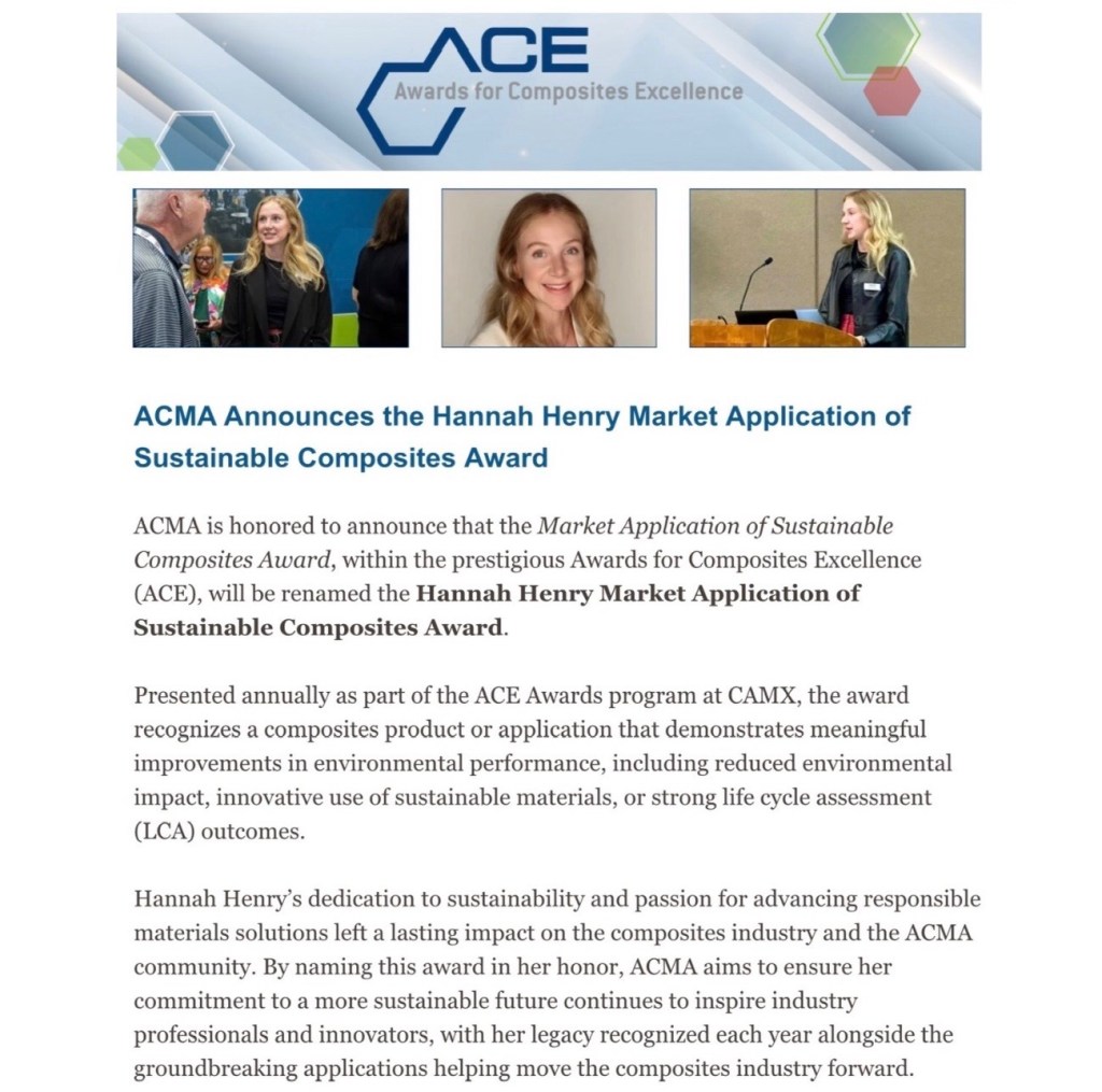 The ACMA (The American Composite Manufacturers’ Association), Hannah’s employer, has renamed an Award they offer in Hannah’s name. The re-naming is recognition that the tools Hannah was devoted to building gave their member companies meaningful ways to assess, manage and improve their longer-term sustainability.